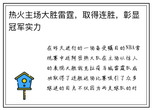 在昨天进行的一场备受瞩目的NBA常规赛中,迈阿密热火队在主场以惊人的表现大胜俄克拉荷马城雷霆队,成功取得了连胜。这场比赛吸引了众多球迷的目光,不仅因为两支球队的对决本身充满看点,更因为热火队在本场比赛中展现出了超强的统治力和深厚的冠军底蕴。
